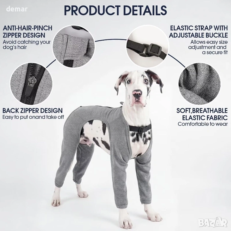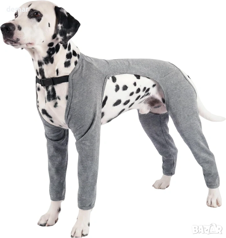 Лек и дишащ възстановителен костюм, изработен от мека, еластична смес от вискоза, която осигурява плътно, но удобно прилягане, без да ограничава движението. Проектиран да предпазва хирургическите места, рани по краката, горещи точки, алергии и кожни раздразнения, той създава сигурна бариера, която помага да се поддържат шевовете чисти и сухи, като същевременно позволява на кучетата да се хранят, спят, ходят и играят нормално. Пълното покритие на крака подпомага възстановяването след процедури като TPLO, ACL, операции на кръстни връзки, коляно и лакът, като предотвратява облизване, хапане и надраскване. Служейки като практична алтернатива на конусите и обемистите електронни нашийници, той намалява стреса и дискомфорта, като същевременно предлага целенасочена защита, без да задържа топлина, което го прави подходящ за целогодишна употреба.