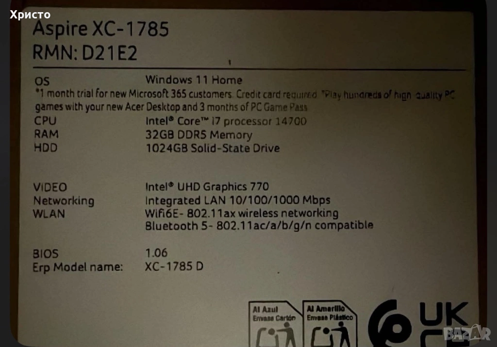 Чисто нов настолен компютър Acer Aspire XC-1785, неразпечатан, в оригинален кашон. Компютърът е закупен от чужбина и никога не е използван. Устройството не е активирано, не е включвано и е в абсолютно ново състояние – както излиза от магазина. Идеален избор за човек, който търси нова, мощна и модерна конфигурация без компромиси. Моделът предлага отлична производителност, подходяща както за работа, така и за тежки приложения, мултитаскинг, офис софтуер, обработка на съдържание и ежедневна употреба. Компактният дизайн на серията Aspire XC го прави практичен както за домашна, така и за бизнес среда. Без бартери!!!