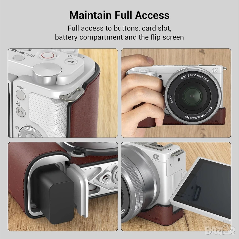 Made of lightweight aerospace-grade aluminum alloy, its bottom plate maintains access to the battery replacement and features a 1/4''-20 threaded hole for attachments to a tripod without taking off the half case.