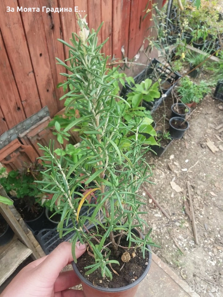 Розмарин – божествената билка за тялото и ума. Цена за 1 саксия 4,49 € Розмаринът може да се ползва за общо укрепване на организма, за възбуждане на апетита и пикочогонно. Билката има изключително тонизиращо и ободряващо въздействие. При натрупан стрес и психическа умора, тя е идеален тонизатор и възвръща чувството за лекота. Също така действа възстановяващо при болни и прекарали наскоро тежко инфекциозно заболяване. Има много добре изразено пикочогонно въздействие. Заради това, че възбужда секрецията на стомашните жлези, билката подобрява и храносмилането. Има и данни, че притежава ясно изразено противохерпесно действие. Бавно заздравяващите рани заздравяват по-бързо благодарение на розмарина. Жлъчката и нейната секреция се стимулират с приемането на чай от Розмарин. При простуди и грип също е много полезно приемането на розмаринова отвара. За лечение на бяло течение и при различни гинекологични оплаквания е добре пациентките да приемат розмарин, тъй като благодарение на него симптомите постепенно изчезват. Розмаринът (Rosmarinus officinalis) е многогодишно тревисто растение с дървенисто стъбло и миризливи вечнозелени игловидни листа. Член е на семейството на ментата и мащерката Устноцветни, което включва и много други билки и подправки. Расте в различни форми, от изправен, до пълзящ. Изправените форми достигат 1,5 м на височина, рядко до 2 м. Листата са вечнозелени, 2-4 см дълги и 2-5 мм широки, зелени отгоре и бели отдолу с гъсти къси власинки. Цветовете са различни на цвят – бели, розови, морави и сини Растенията са в контейнери, което позволява засаждането им да се извършва почти целогодишно. Много от растенията променят вида си през периодите на своята вегетация, но тук в сайта със снимки се представят в най-атрактивния им вид. Повечето снимки в сайта ни покзват как ще изглеждат растенията след определен период и положени необходимите грижи. Моля разгледайте и другите ни растения в сайта. Благодарим че избрахте нас 😊 Тел. 0877977519