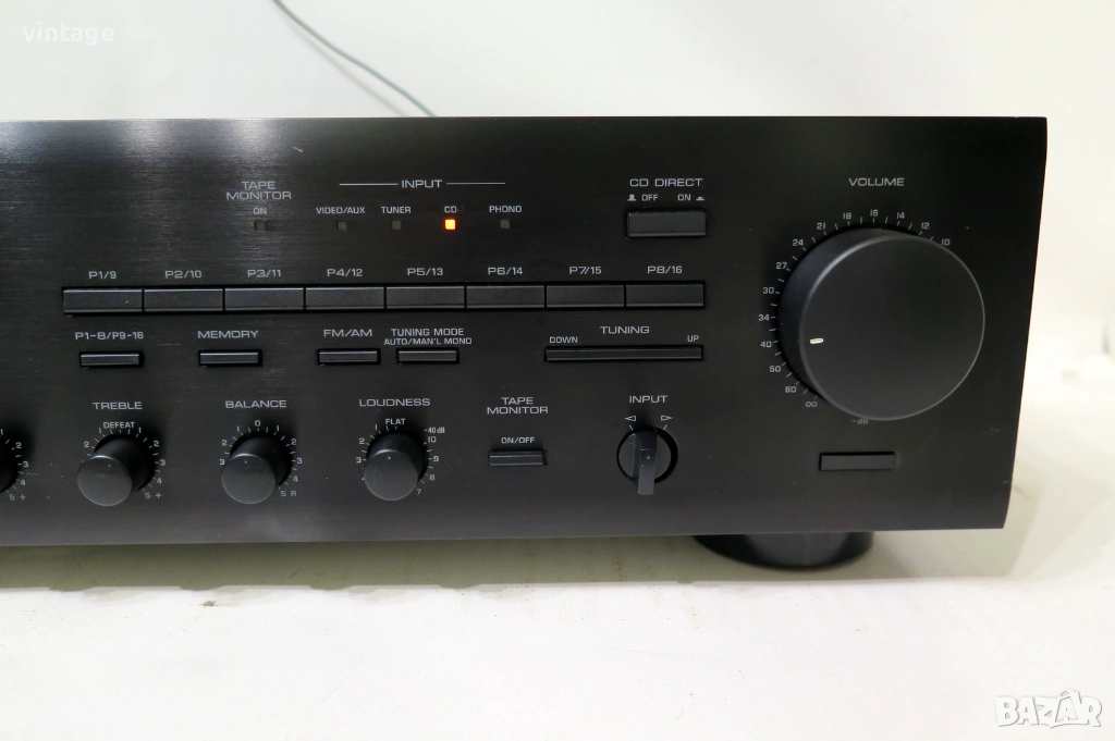 Транзисторен стерео ресийвър, отличен технически, много добър външен вид. Цифров тунер с памет, индикатор за силата на приемания сиггнал. Корекции: bass, treble, variable loudness, CD direct. Дистанционно управление не е налично. Приложените снимки и видео са реални!