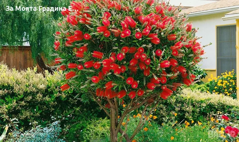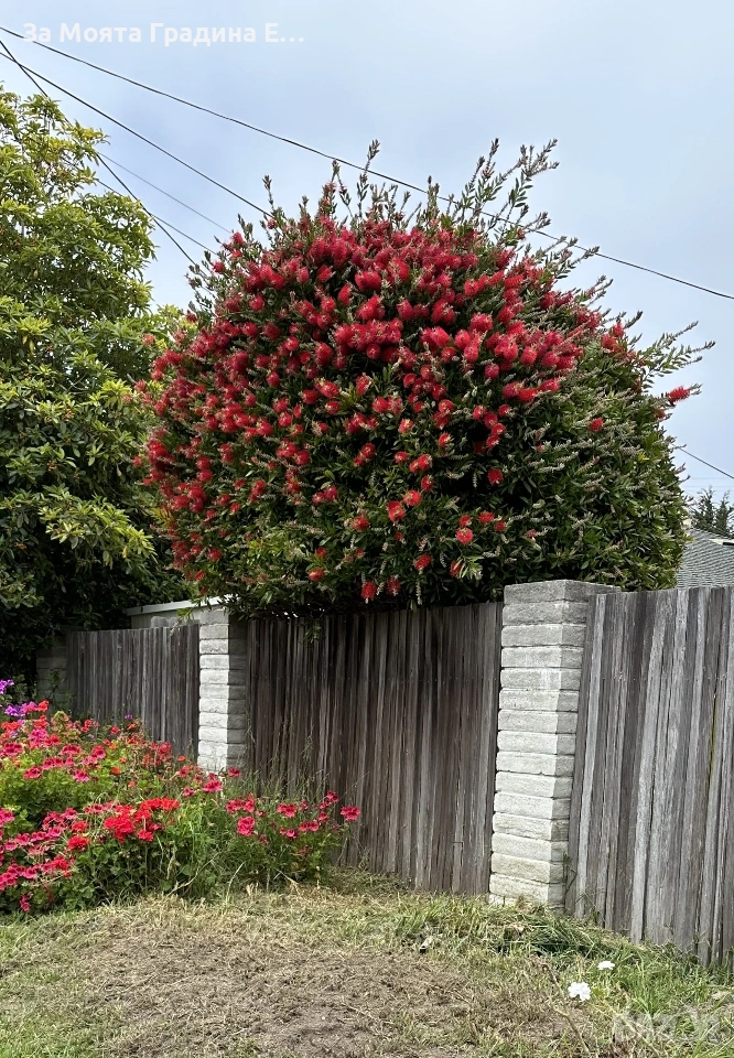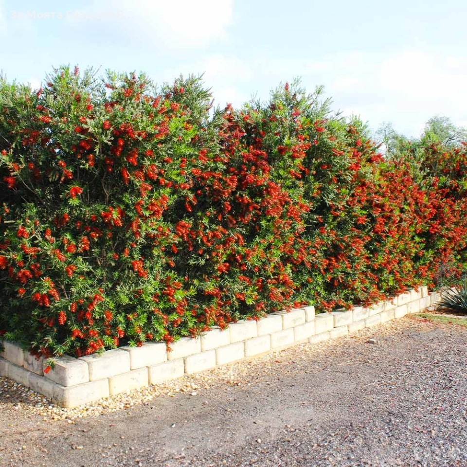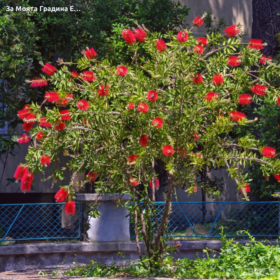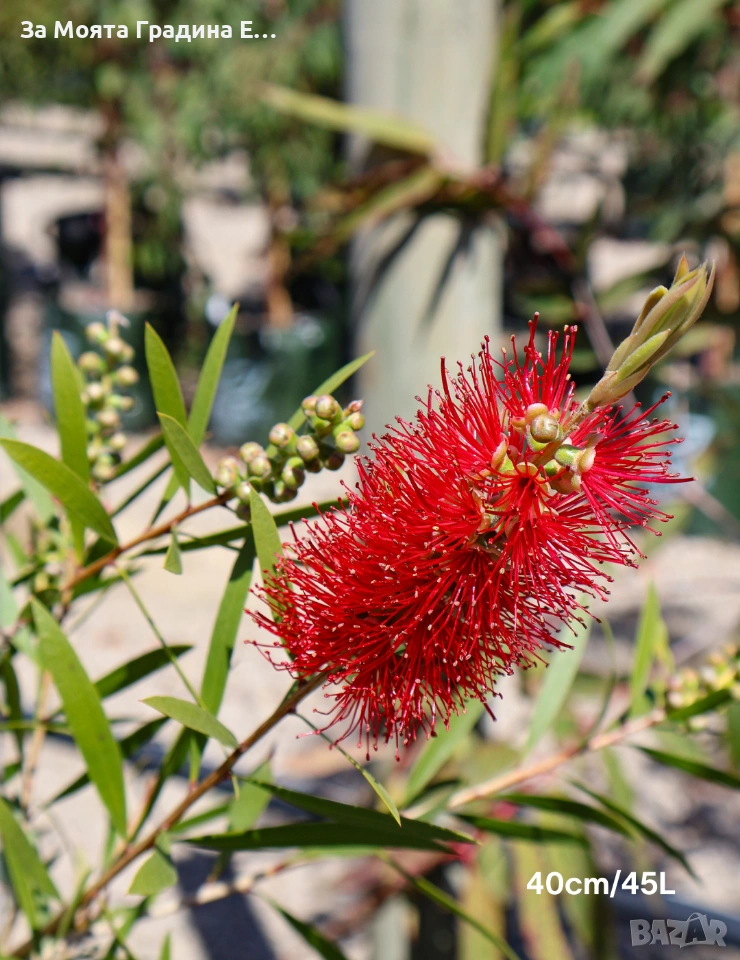 Калистемон (Callistemon citrinus) Размер 60-80см Цена 16.49€ Размер 10-20см Цена 6,49€ Прекрасно растение с цветни класове, представляващи тъмночервени тичинки дълги 2.5 см и разположени около стъблото. На височина достига до 10 см. Листата му са изключително твърди, кожести, дори бодливи. Цветовете са трайни и падат след около 2 месеца. След тях остават твърди сиви плодници. Обича много светло и проветливо място място. Предпоставка за добро развитие и обилен цъфтеж са ярките слънчеви лъчи. Прибира се след първото застудяване на светло и прохладно място при температура 5-10°С. Температурата не бива да пада под -5°C, тъй като това може да го унищожи. Растенията са в контейнери, което позволява засаждането им да се извършва почти целогодишно. Много от растенията променят вида си през периодите на своята вегетация, но тук в сайта със снимки се представят в най-атрактивния им вид. Повечето снимки в сайта ни покзват как ще изглеждат растенията след определен период и положени необходимите грижи. Моля разгледайте и другите ни растения в сайта. Благодарим че избрахте нас 😊 Тел. 0877977519
