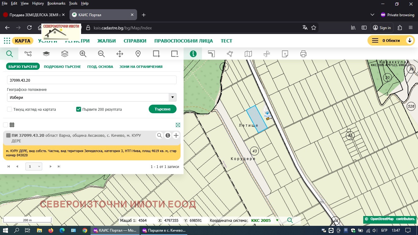 ID.4487Североизточни имоти Ви предлага за продажба парцел с площ от 4620квм със статут на земеделска земя трета категория в местност КУРУ ДЕРЕ в землището на с. Кичево. Намира се над бензиностанция Лукойл. Комуникации - на границата на парцела.