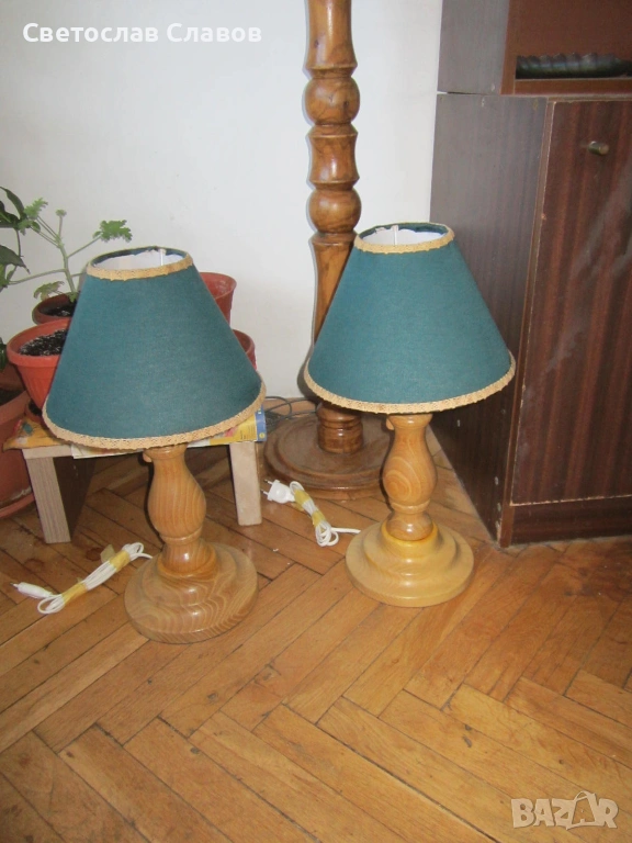 Комплект настолни /нощни/ лампи.Стойките на лампите са от стругована акация, високи са 50 см., в зелен цвят и с украсителни ширити по кантовете си.