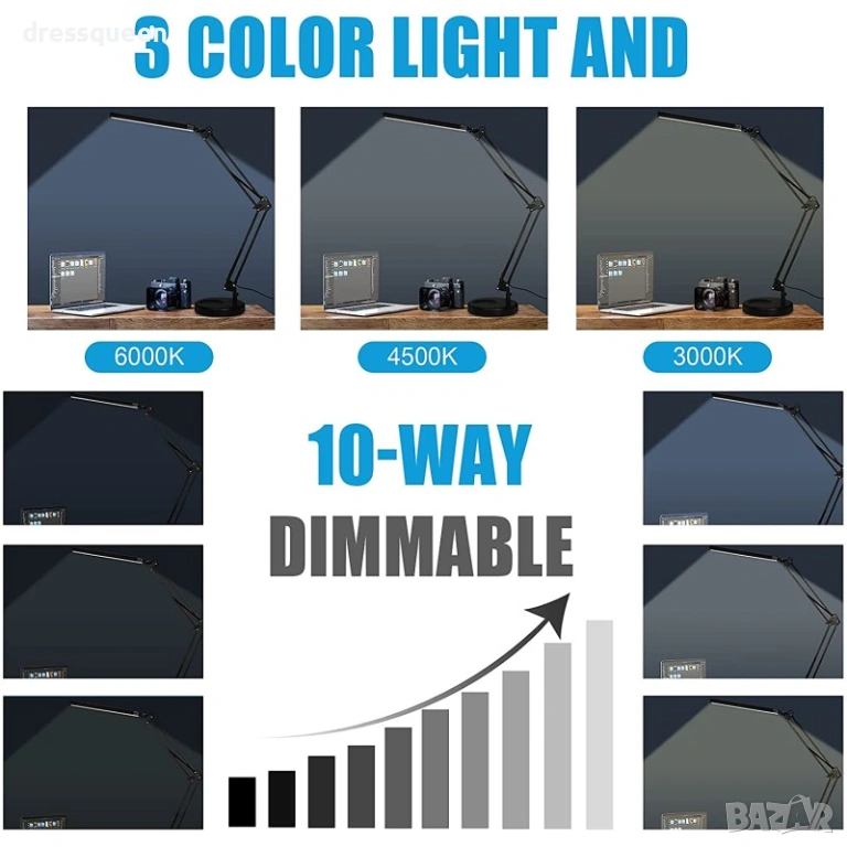 Избирай между топла светлина (3000K), неутрална дневна (4500K) и студена бяла (6000K) според задачите си. С плавно регулиране на яркостта и безвредна за очите LED технология, лампата е подходяща за четене, работа, гримиране и дори вечерно настроение.