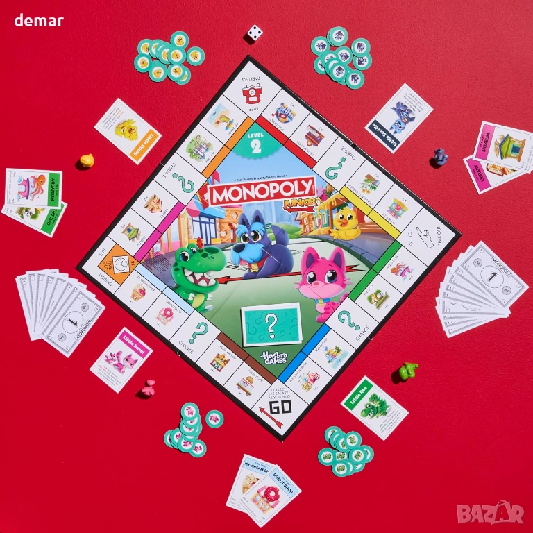 „Монополи Джуниър“ е настолна игра „2 в 1“, предназначена за деца на възраст 4 и повече години. Тя включва двустранна дъска с две прогресивни нива на игра, които се адаптират с растежа на децата. Ниво 1 (4–5 години) предлага опростен геймплей, фокусиран върху броене на полета и съпоставяне на картинки, докато купуват имоти, помагайки на по-малките играчи да развият основни умения за разпознаване на числа. Ниво 2 (6+ години) въвежда четене и проста математика, насърчавайки децата да практикуват броене и управление на собствените си пари. Всяко ниво включва собствен набор от игрови пари и карти за игра, подходяща за възрастта. С подходящи за деца локации и четири забавни жетона с герои, играта съчетава учене и забавление, като същевременно запазва класическата цел да притежаваш най-много, за да спечелиш.