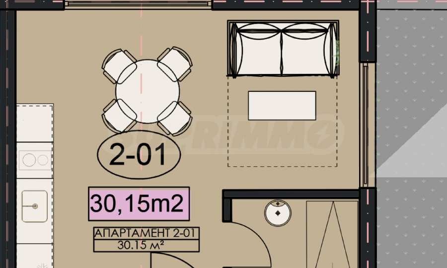 Апартаментът е едностаен, ситуиран на етаж 2 и има обща площ 39.65 кв.м.