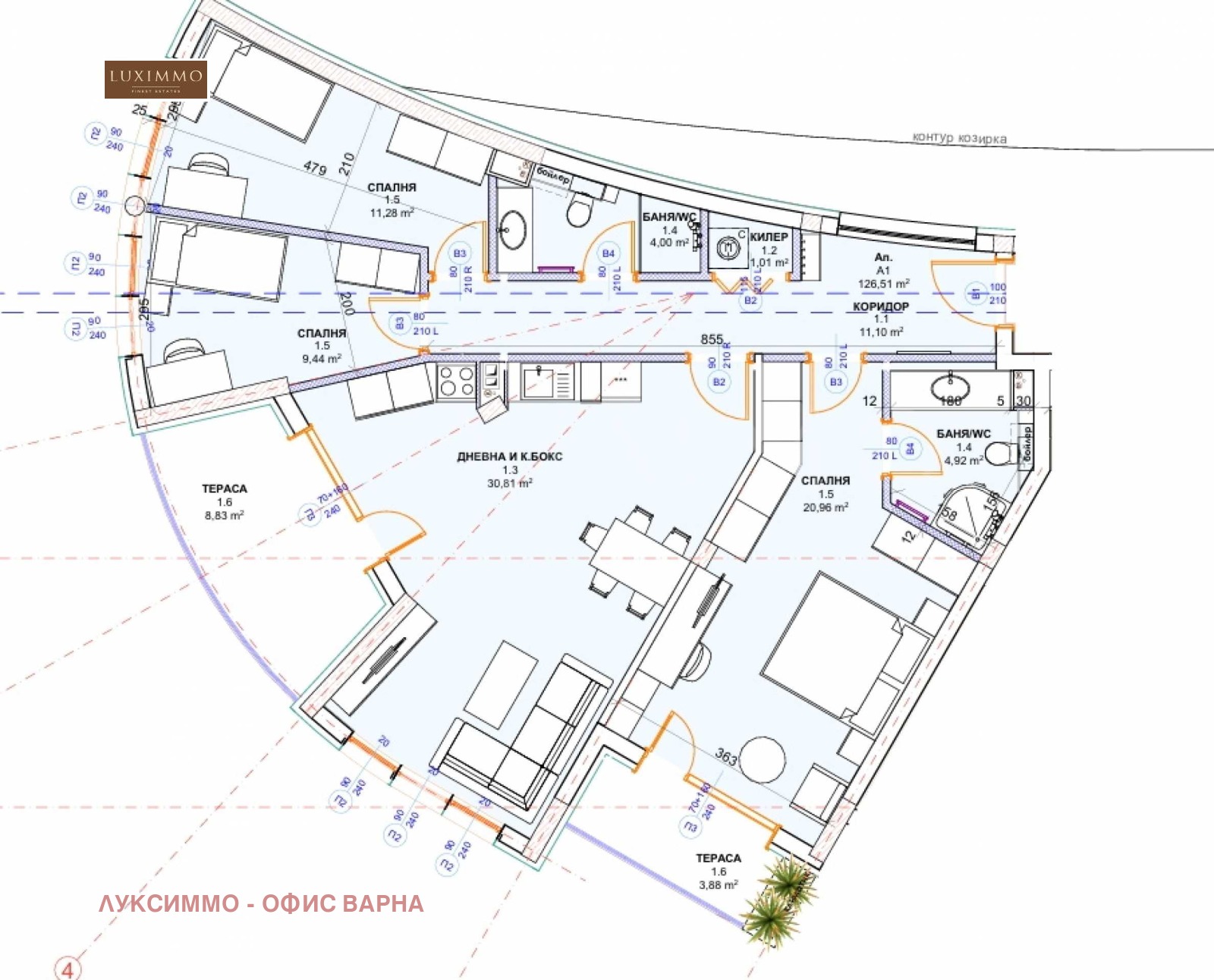 Представяме четиристаен апартамент в луксозен комплекс с невероятна морска панорама в най-зеления район на град Варна - Св. Св. Константин и Елена, на 120 м от плажа, на 10 минути от централната част на града, сред зеленина, тишина, чист въздух, уют и спокойствие в естествен парк, до автобусна спирка на градския транспорт, на 20 минути до международно летище.
