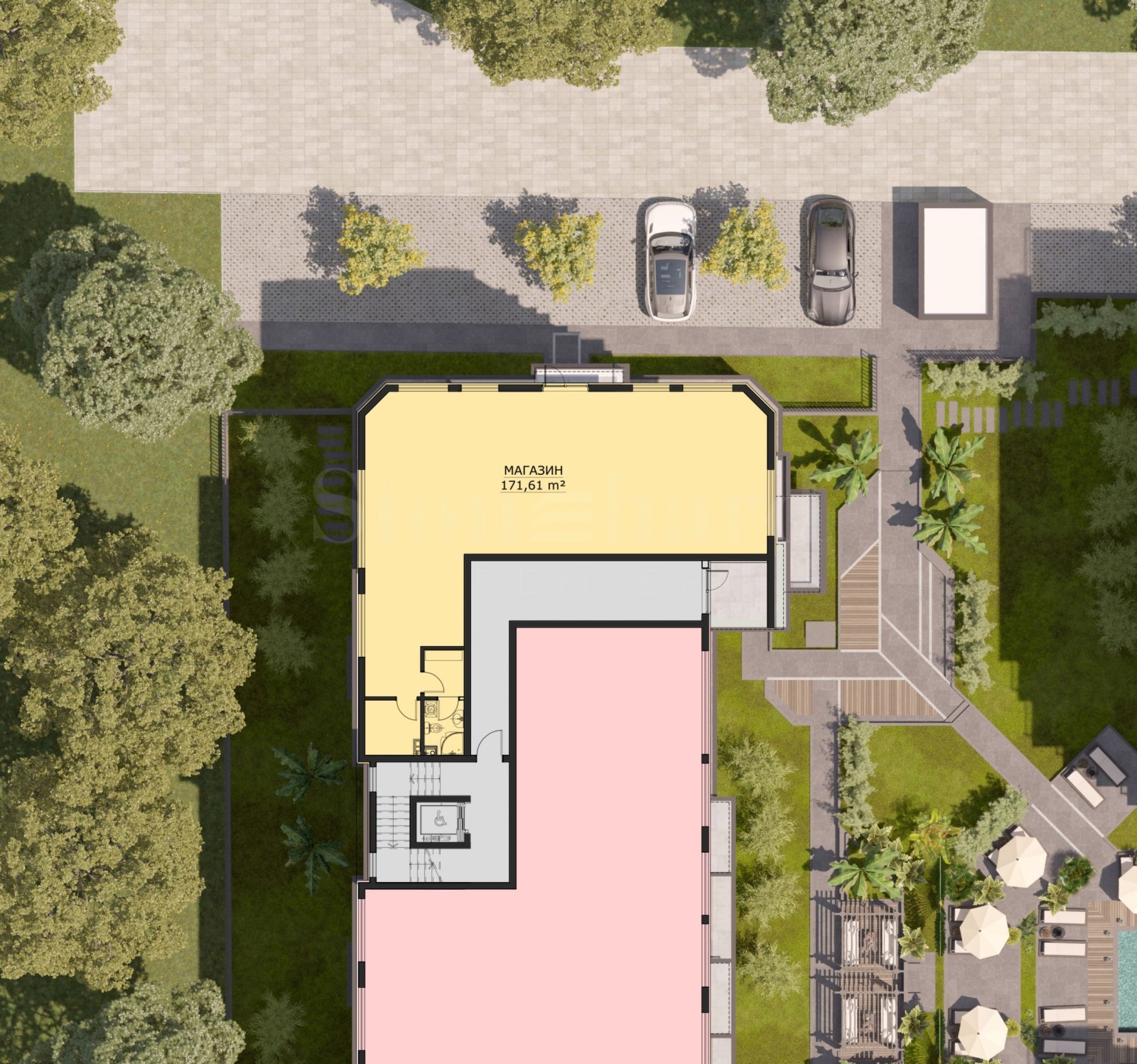 Имотът с обща площ от 171.61 кв.м е разположен на 1-ви етаж от 6, издава се в степен на завършеност 'до ключ'. Има възможност за закупуване на паркомясто и склад допълнително.