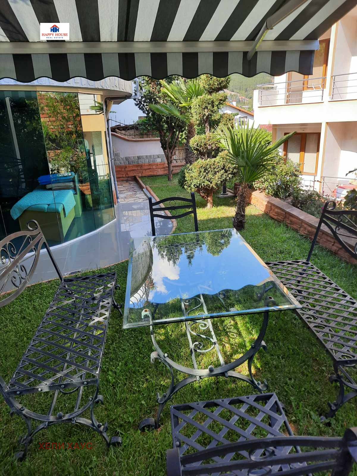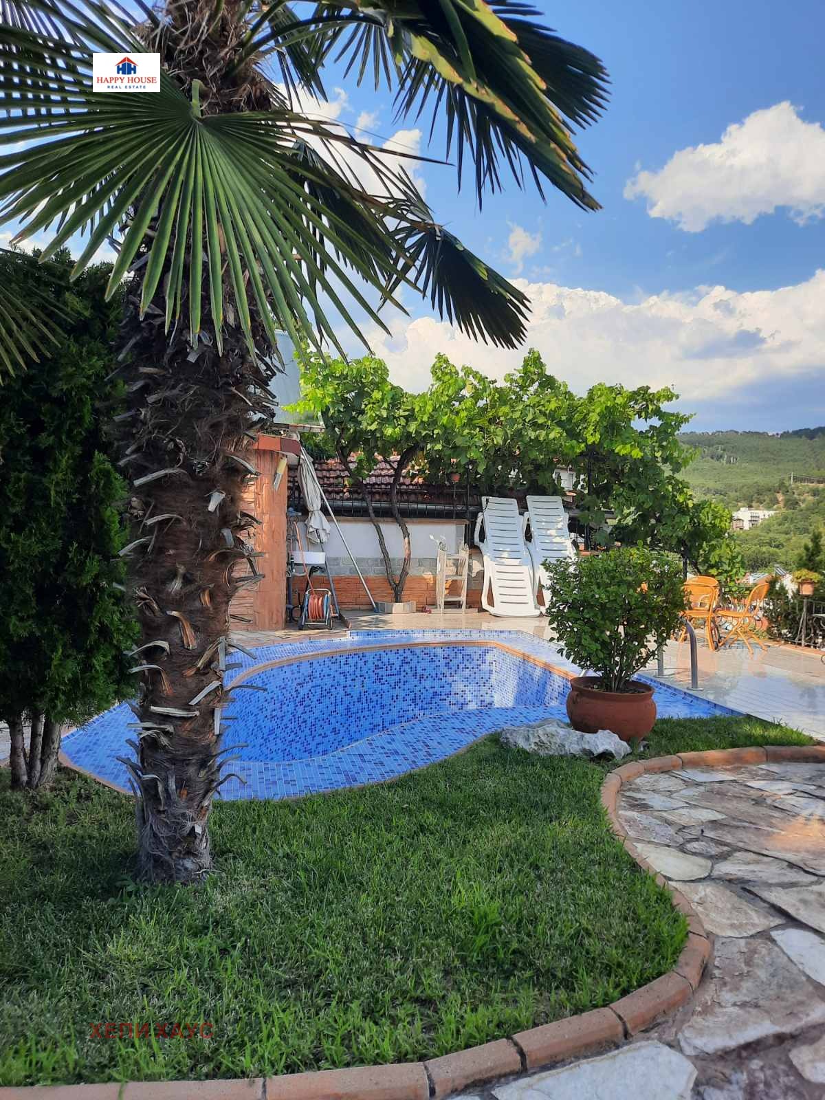 е с напълно индивидуален достъп до собствен двор с басейн, сауна, лятна кухня и много добре поддържана градина