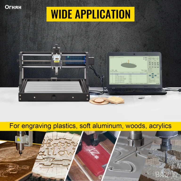 Тази CNC машина за гравиране може да гравира всички видове пластмаси, мек алуминий, дърво, акрил, PVC, PCB и широка гама от други меки материали.