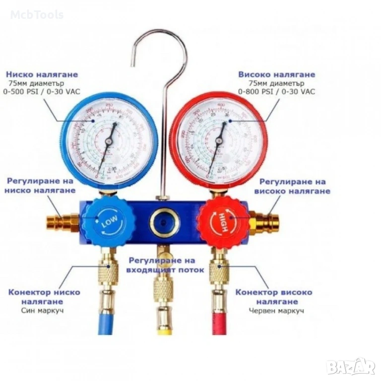 Комплект манометри за диагностика на фреон R12, R22, R134A, R410A, R404A. Състои се от колектор с маркучи и бързи връзки за смяна на хладилен агент, манометричен блок двоен за климатици, на регулируем разклонител, 3 броя 140см цветни маркучи с накрайници, спирателни вентили за високо и ниско налягане и индикатори за налягане за диагностика без сервизни устройства.