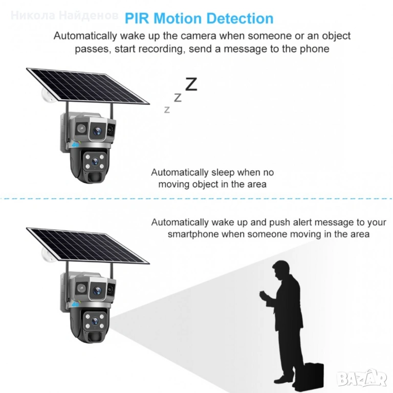 Откриване на движение: Вградените сензори за движение задействат видеозапис, когато открият подозрителна дейност, което ви позволява да бъдете предупредени в реално време.