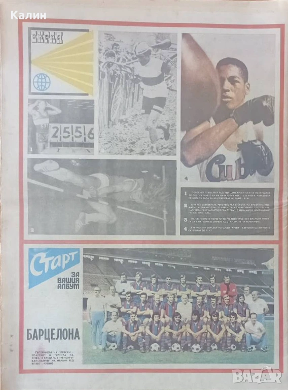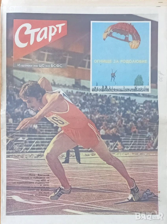 Продавам брой 248 от 2 март 1976 година на вестник „Старт” на цена 10.50 евро, със снимка на първата страница на Янко Братанов-европейски шампион по лека атлетика в зала на 400 м. с препятствия и снимка на последната страница на футболният клуб на Барселона (Испания), с Йохан Кройф в състава си-съперник на „Левски-Спартак” в 1/4-финал от турнира за Купата на УЕФА.