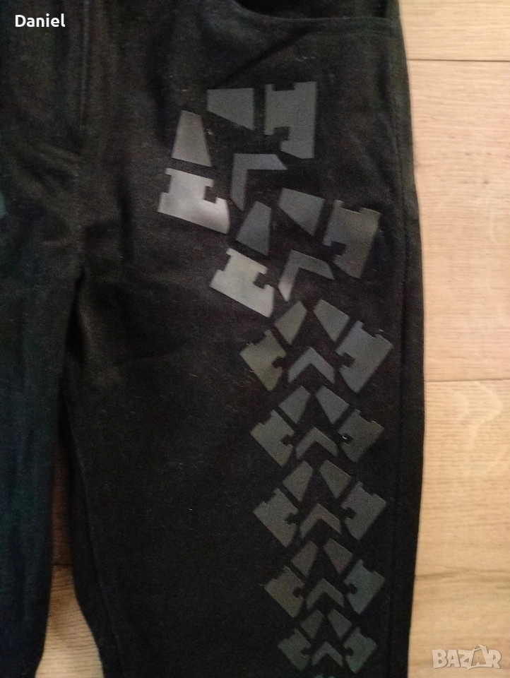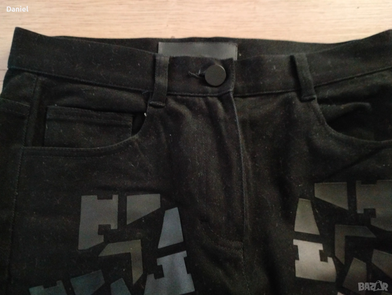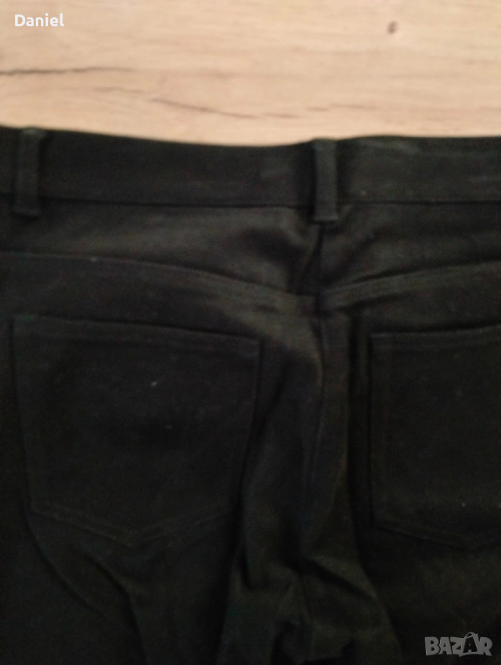 Панталон от черен деним, здрав и плътен памучен плат, слим без еластичност с интересни фини кожени елементи в предната част, елегантен, без следи от употреба, почти нов, отговаря на S размер...
