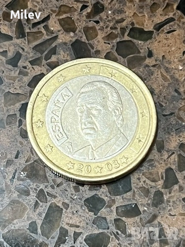 Продавам оригинална монета 1 евро от 2003 година, емисия на Испания, с характерния дизайн на испанския крал Хуан Карлос I на лицевата страна. Тази монета е част от серията евро, пусната в обращение след въвеждането на еврото.
