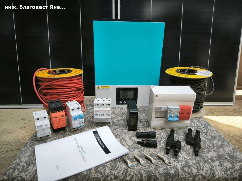 Комплекта който ви предлагаме е примерна конфигурация избрана от нас и съдържа : (хибриден инвертор 3 в 1- 12 волта с цифров дисплей,чиста синусоида 50 херца осигуряващ 1500 вата номинална мощност в комплект с 8 бр. фотоволтаични панели 180 вата). Панелите са употребявани,тествани и проверени с 100% ПРОИЗВОДИТЕЛНОСТ.Пожелание може да промените инвертора или панелите според вашата потребност,може също така да бъдат оборудвани с всякакъв вид и размер батерии. Разполагаме с много варианти на всички компоненти за фотоволтаични системи, както с такива втора ръка (задължително проверени и функциониращи с гаранция), така и нови.