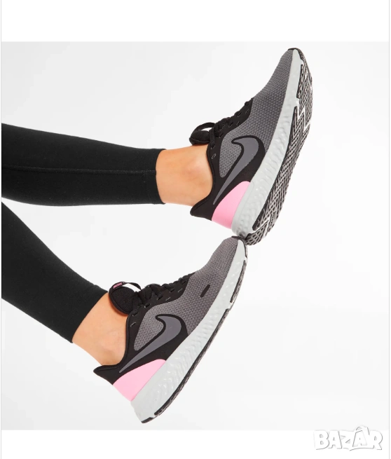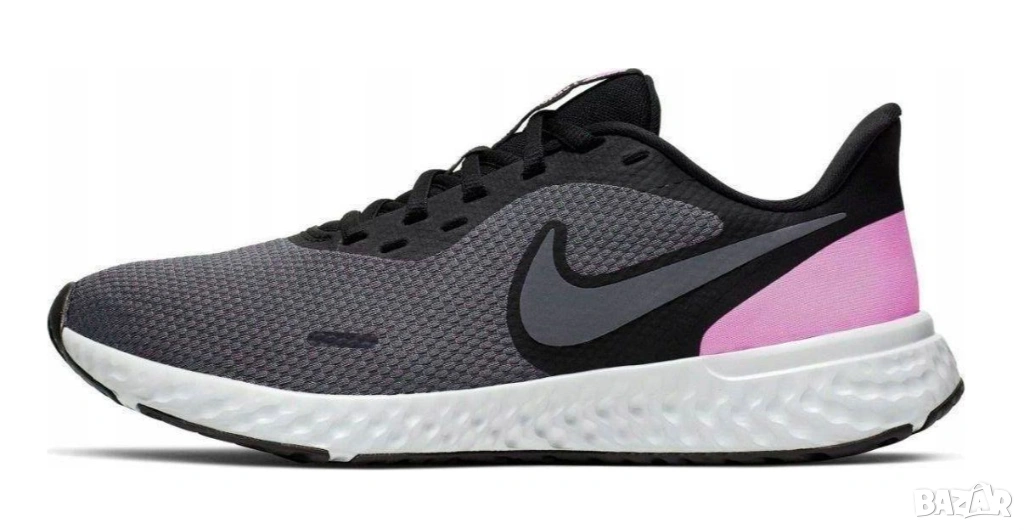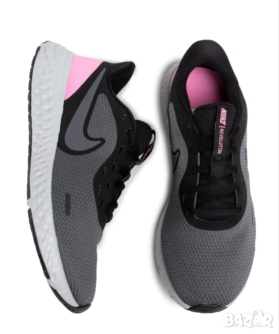 Nike Revolution 5 – леки дамски маратонки, предназначени за бягане на асфалт и ежедневна употреба. Този конкретен модел се отличава със сив основен цвят ("Dark Grey") с акценти в розово ("Psychic Pink") и черни детайли.