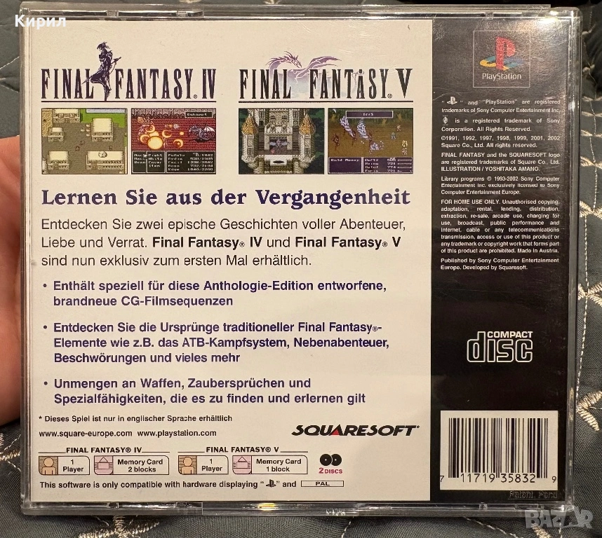 Final Fantasy Anthology за PlayStation 1 (PS1), снимка 1 - Игри за PlayStation - 53639011 Final Fantasy Anthology за PlayStation 1 (PS1), снимка 2 - Игри за PlayStation - 53639011 Final Fantasy Anthology за PlayStation 1 (PS1), снимка 3 - Игри за PlayStation - 53639011 Final Fantasy Anthology за PlayStation 1 (PS1), снимка 4 - Игри за PlayStation - 53639011 Final Fantasy Anthology за PlayStation 1 (PS1), снимка 5 - Игри за PlayStation - 53639011 Final Fantasy Anthology за PlayStation 1 (PS1), снимка 6 - Игри за PlayStation - 53639011 Final Fantasy Anthology за PlayStation 1 (PS1), снимка 7 - Игри за PlayStation - 53639011 Final Fantasy Anthology за PlayStation 1 (PS1), снимка 8 - Игри за PlayStation - 53639011 1/8