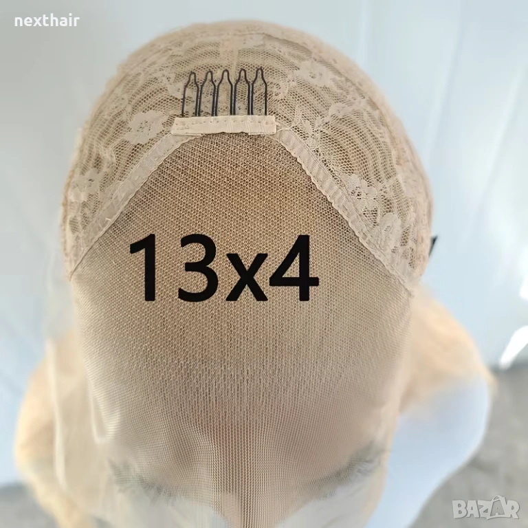 Пепеляво руса права перука с малко по-тъмни корени, дължина 80 см. Моделът е с 13x4 дантелена (lace) зона отпред, която позволява естествена линия на косата и различни варианти на път - по средата или встрани.