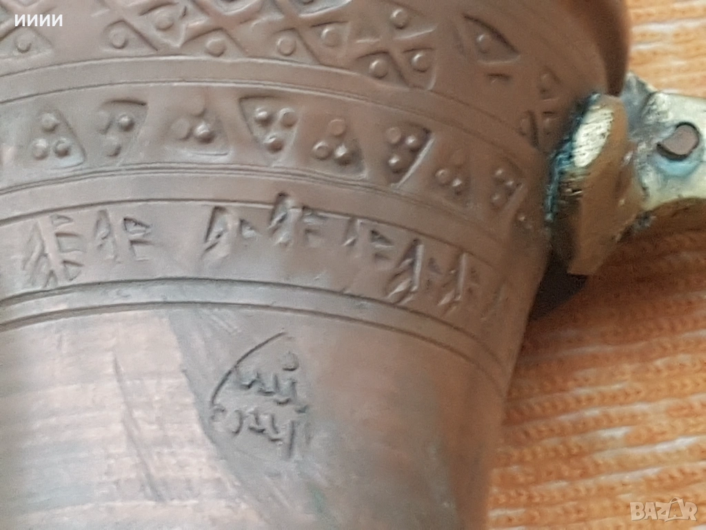 Над 200-годишен ръчно изработен от кован бакър и бронз. Запазен и здрав,без никакви забележки и може да се ползва. Когато се носи звъни.