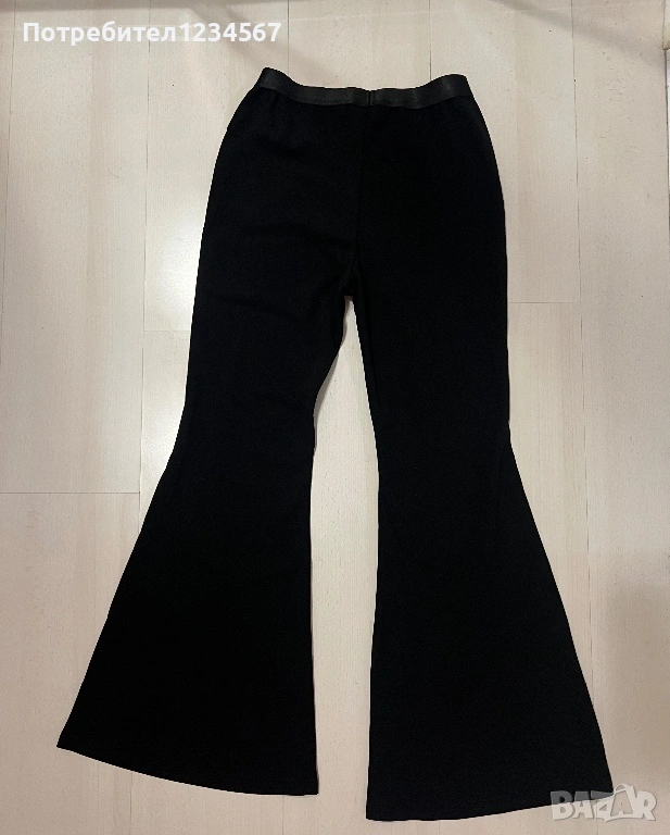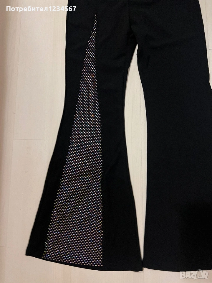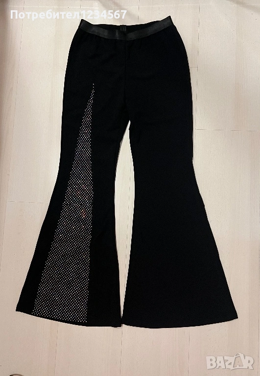 Ефектен НОВ черен панталон тип клош с модерна визия и стилен акцент. Моделът е с еластичен за комфорт и перфектно прилягане. Единият крачол е декориран с впечатляваща фина мрежа с блестящи камъчета, която придава елегантност и сценично излъчване. С рр, става и за ХС.