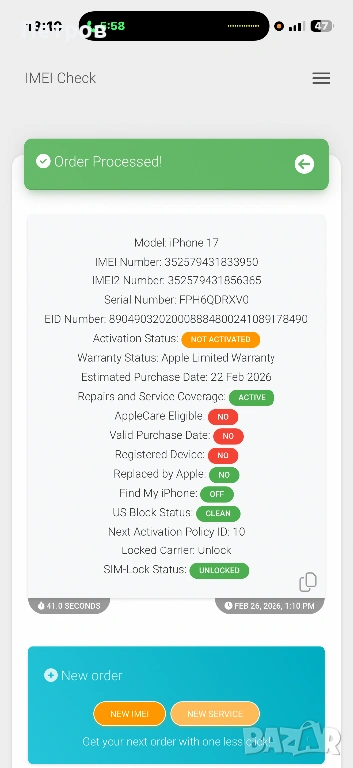 Продавам тези невероятно красиви Iphone 17 Mist Blue и White / Син и Бял - 256 GB в ЧИСТО НОВО състояние. С фабричните си лепенки! (Прикачвам снимки от приложението на Apple (Support)) Също така прикачвам снимка и от платена проверка в imeichecker, че няма никакви заключвания и, че е платен еднократно.