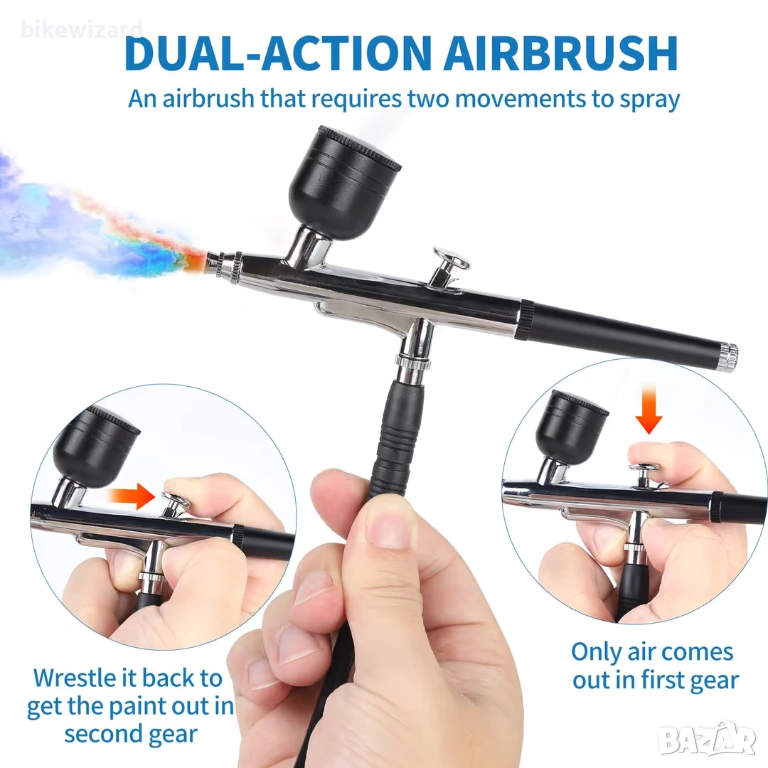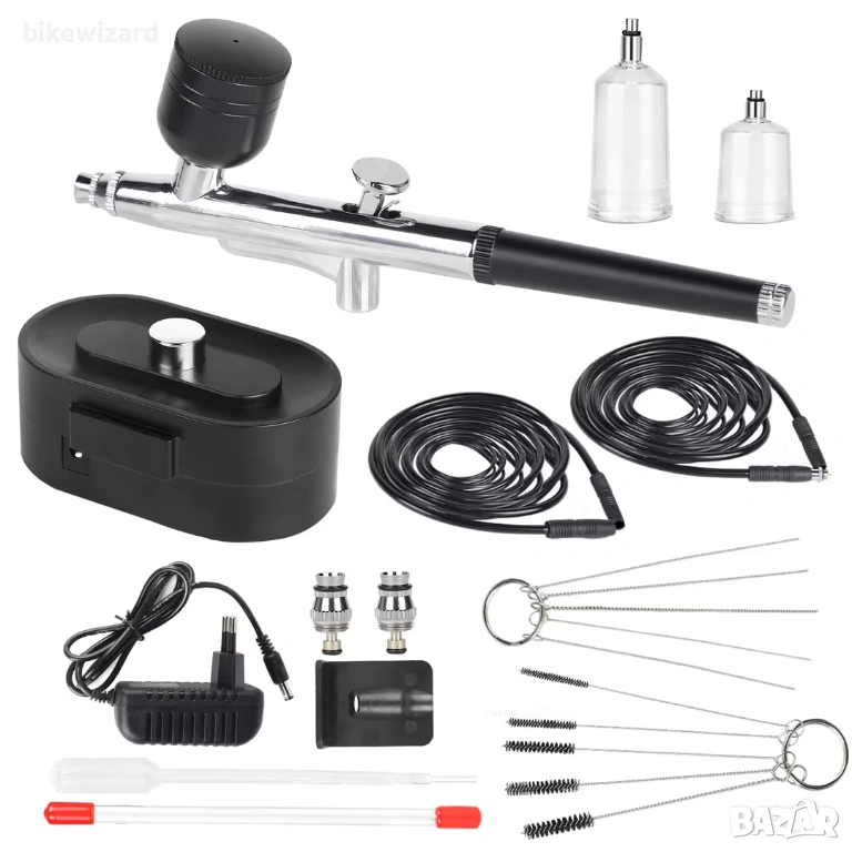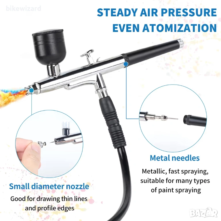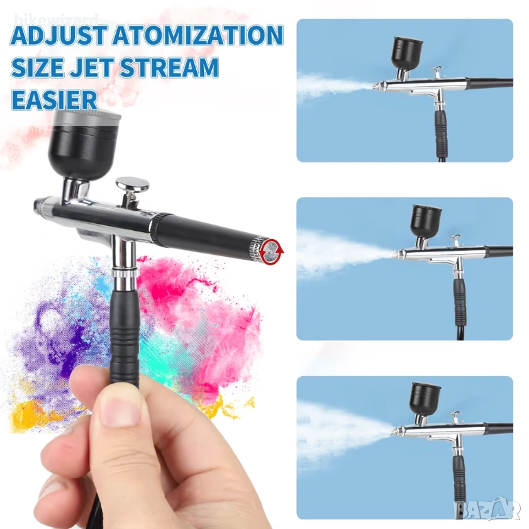 Аерограф с двойно действие Аерографът разполага с дюза 0,35 мм, която прецизно пръска фини линии и осигурява равномерно пръскане. Аерографът позволява прецизен контрол на количеството течност, боя и въздух благодарение на спусъка и е подходящ както за изключително фини детайли, така и за пръскане на големи площи. Регулиращият бутон в края на пистолета за аерограф регулира размера на пръската, което улеснява пръскането. 【Универсални приложения】 Комплектът аерограф се използва широко за рисуване върху керамика, рисуване на модели, рисуване върху тяло, дизайн на нокти, арт рисуване, декориране на торти и много други. Комплектът аерограф е подходящ за различни видове лакове, включително бои на водна основа, акрилни бои, предварително смесени маслени бои, метални бои, матови лакове и емайлирани бои. Подходящ за начинаещи, напреднали художници и професионалисти. Мини компресор за аерограф Компресорът за аерограф има функция за автоматично включване/изключване. Спира при максимално налягане от 40 PSI и произвежда налягане от 15 psi, ако е необходимо. Когато налягането намалее, той автоматично ще се рестартира. След като бъде включен, аерографът работи само по време на пръскане и се изключва, когато не пръска, което ефективно защитава компресора. Забележка: Тествайте комплекта за аерограф с чиста вода, преди да използвате бои, за да се уверите, че аерографът не е запушен и може да пръска нормално. Разредете гъстите бои или течности с вода или разредител. Почиствайте аерографа след всяка употреба.