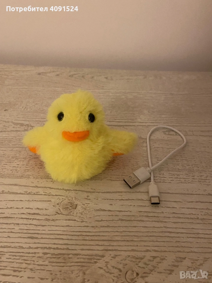 Плюшена електрическа играчка за котки, наподобяваща “живо” пате. При допир патето започва да издава звуци и да размахва с криле. Зарежда се с usb-c кабел, има копче за изключване.