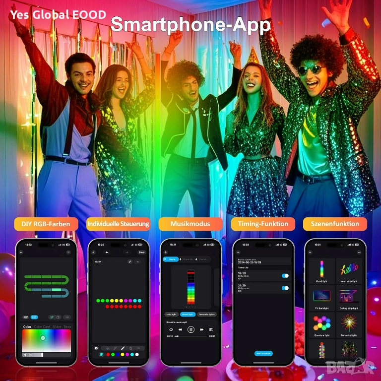 С над 300 сценични режима и функция Music Sync, лампата реагира на музиката и създава динамична атмосфера. Разглобяемият дизайн позволява регулиране на височината според нуждите и интериора.