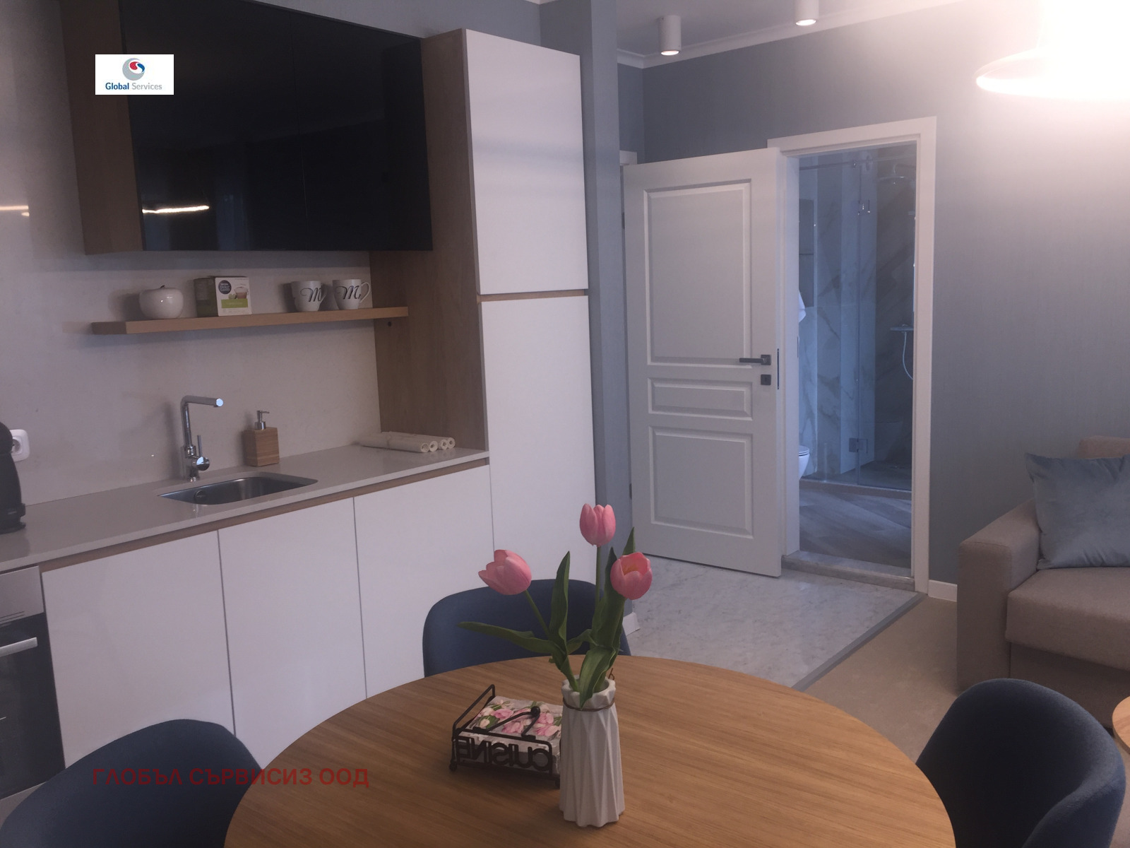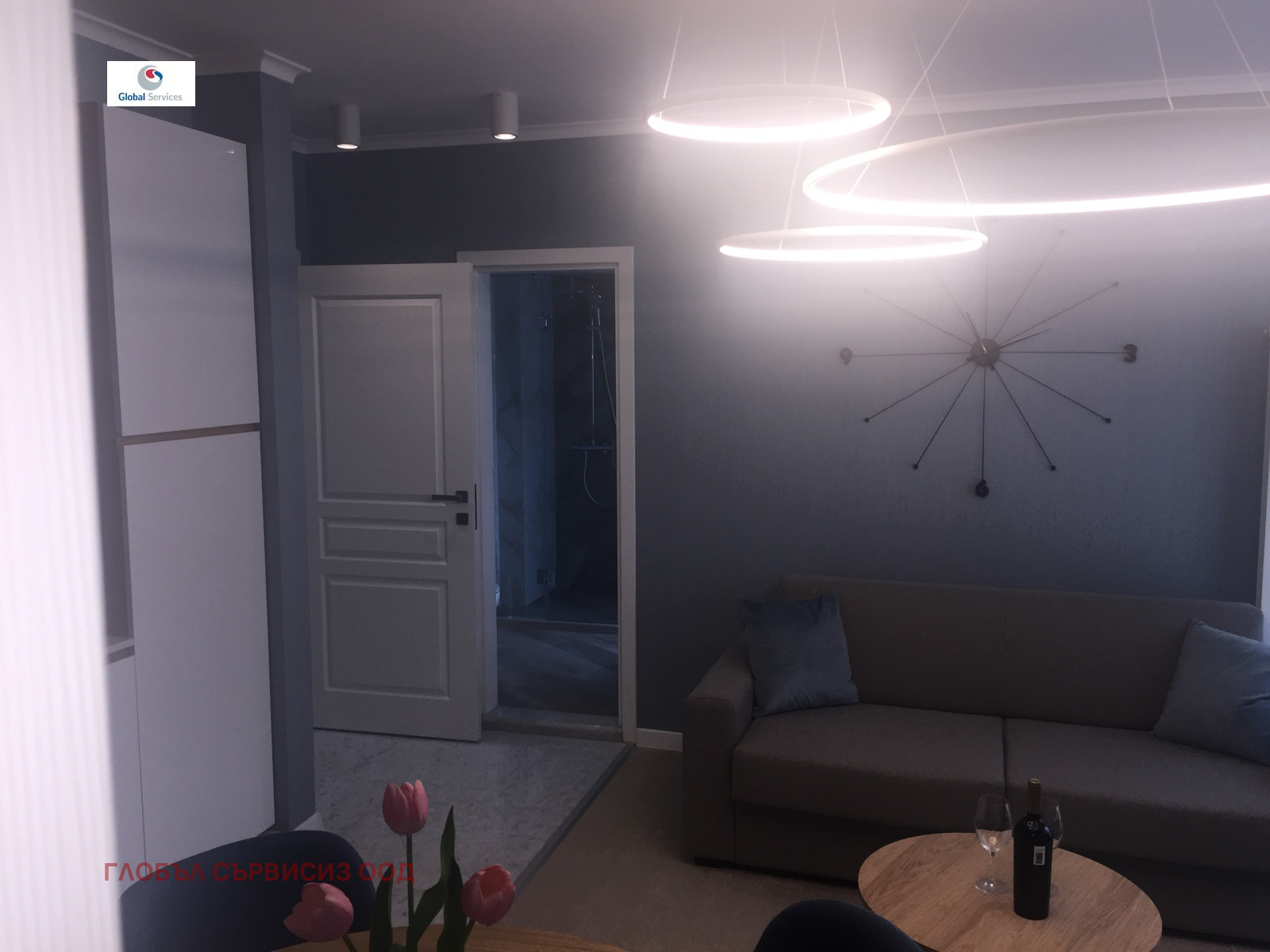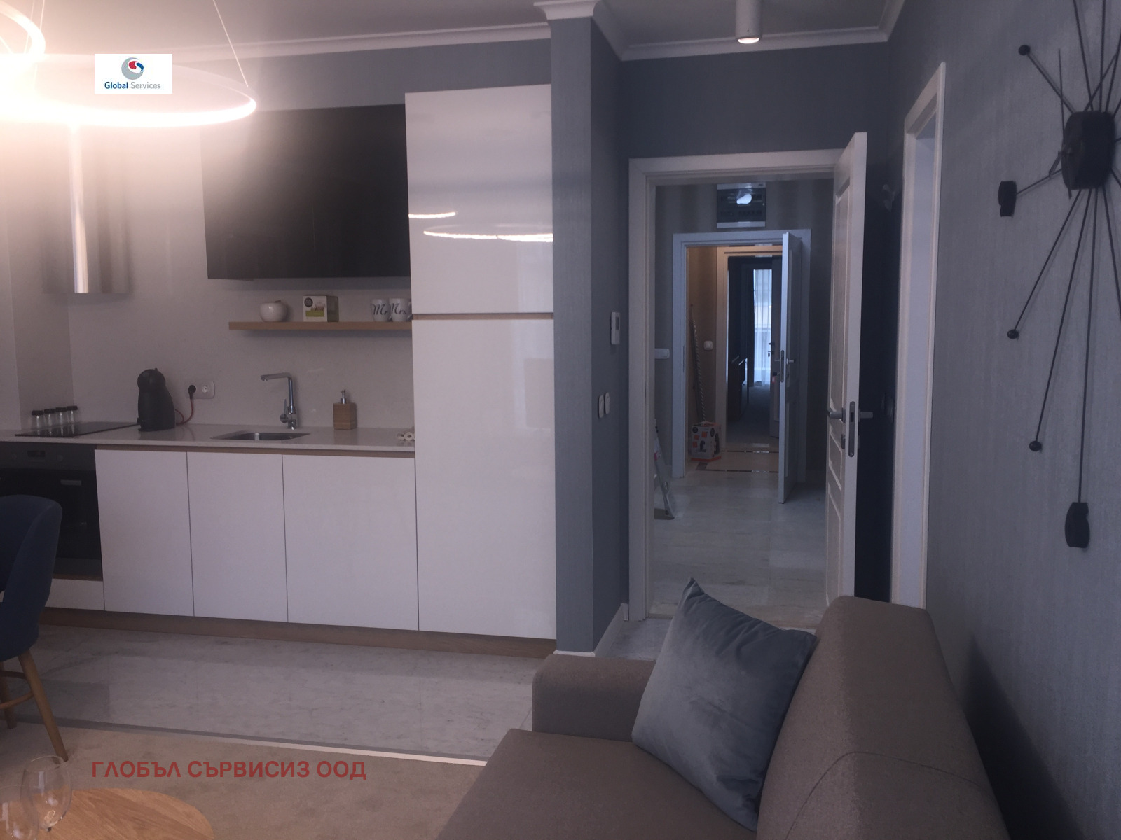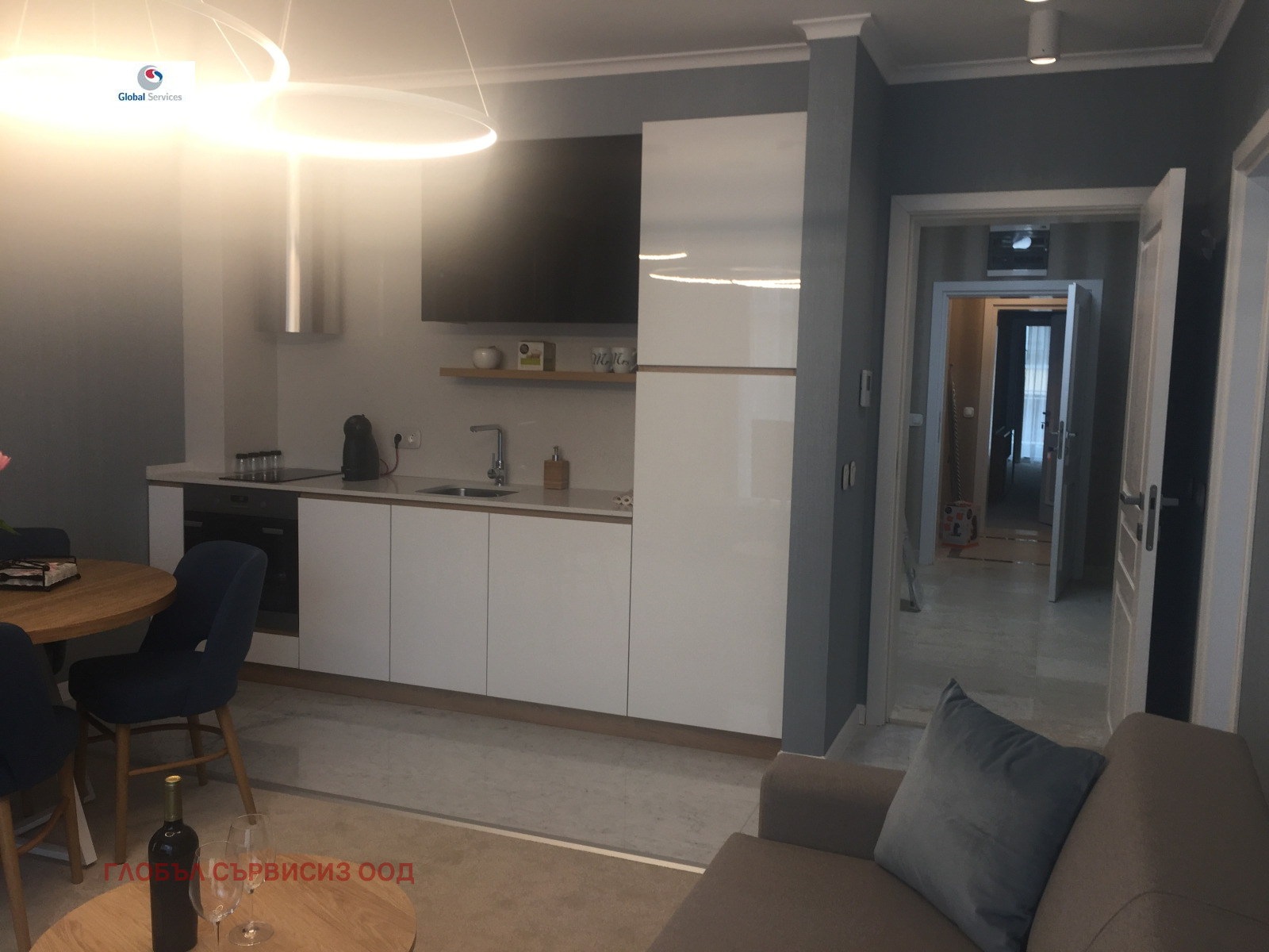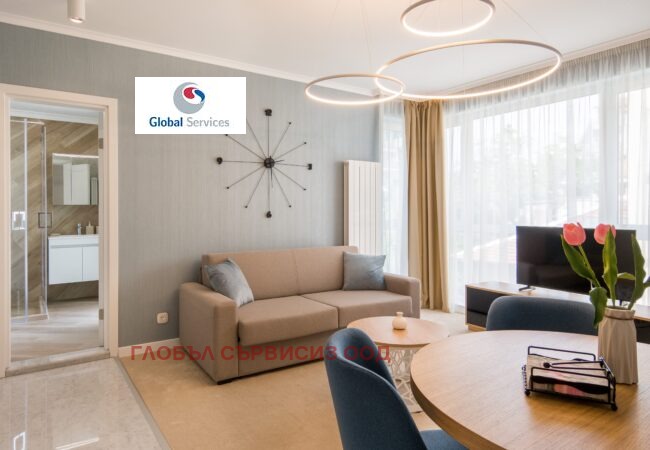 Модерно ново жилище с прекрасен интериорен дизайн и луксозно изпълнени общи части. Разпределение: - напълно оборудвана дневна, маса за хранене, кухненски бокс с вградени електроуреди (пералня със сушилня, печка, котлони, миялна, хладилник), кухненски съдове, чаши,кафе машина, ел.кана за вода, чинии и прибори;