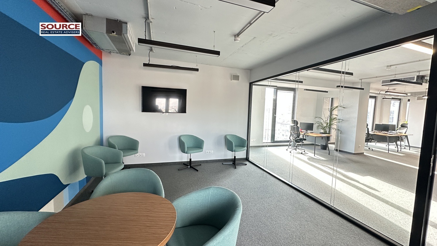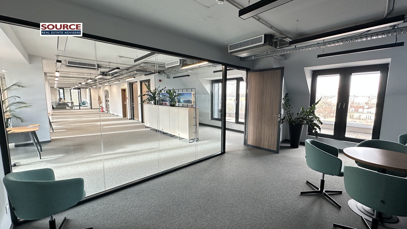 2. Разпределение: 1 голямо Open space помещение, 3 отделни работни помещения преградени със стъклени и гипсокартонени преградни стени, 2 колрум-а, представителна рецепция, оборудвана кухня, 2 wc, тераса. Офисът може да бъде изцяло с Open space разпределение или допълнително преграден според изискванията на Наемателя.