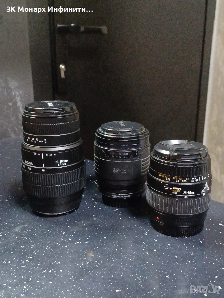 Фотоапарат се продава с три обектива с три батерии + зарядно както се вижда на снимките