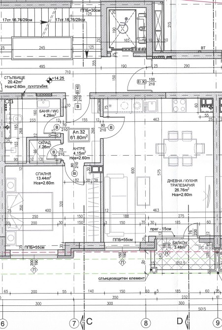 Състои се от: дневна с кухненски бокс, спалня, баня с wc, склад и балкон;