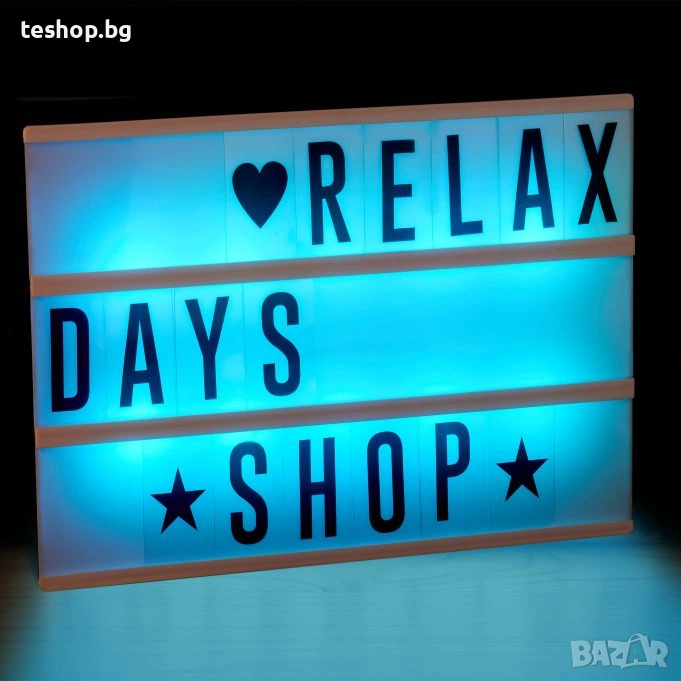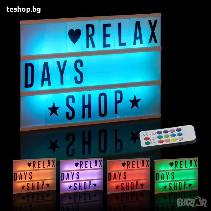Тази светлинна кутия, която може да се закачи или постави изправена, ще ви помогне да създавате съобщения с готини ефекти. Можете да избирате между 85 букви и символа. Позволете на креативността си да се развихри! Фонът може да свети в тринайсет различни цвята и с три ефекта. Можете да изберете как да се показва съобщението с дистанционното управление. Кутията с три реда може да остане включена за четири или осем часа, като можете да настроите таймера, за да определите кога ще се изключи. Можете също така да я деактивирате с дистанционното.