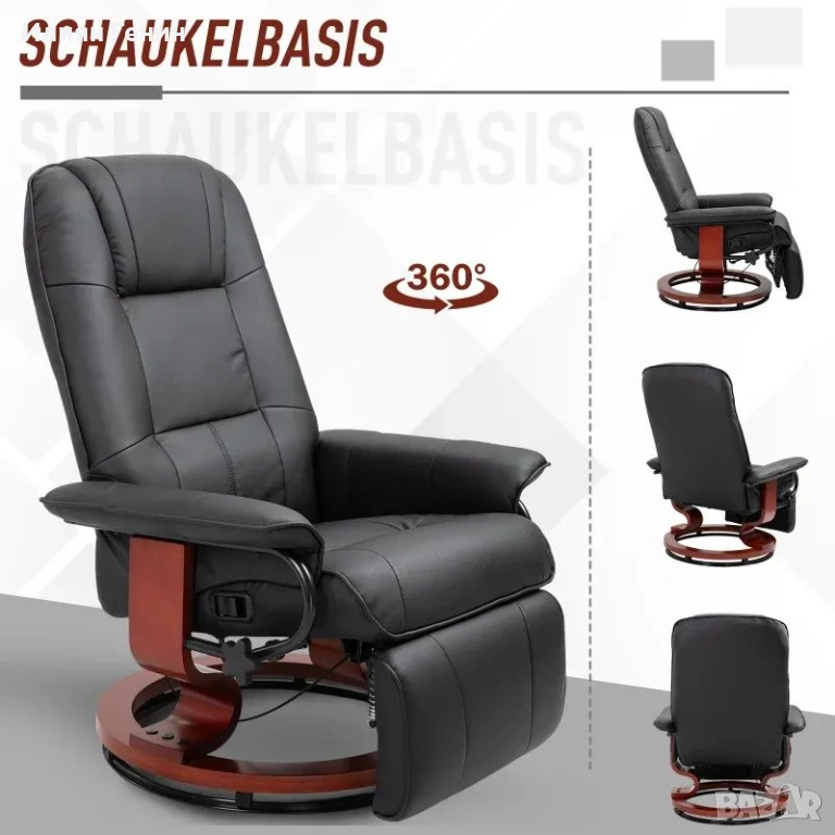 HOMCOM ТВ фотьойл с регулируема облегалка, изкуствена кожа, въртящ се на 360° и 145°, накланящ се, черен, 78 x 87 x 100 см - 220.00 €.