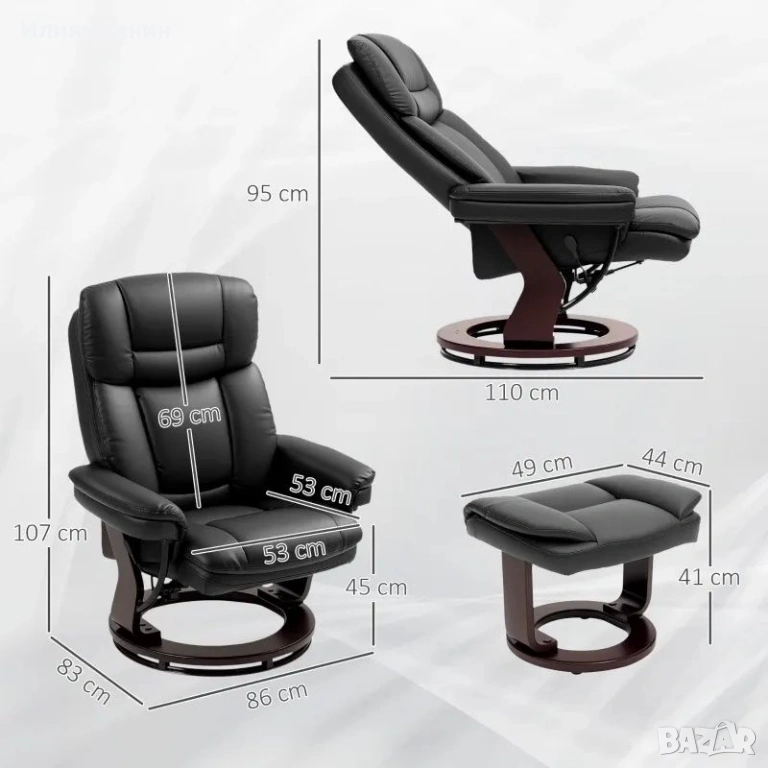 Включително табуретка: Разтегателният фотьойл с функция за накланяне и табуретката се отличават с елегантен, заоблен дизайн и са тапицирани с лесна за поддръжка изкуствена кожа, която е едновременно стилна и удобна.