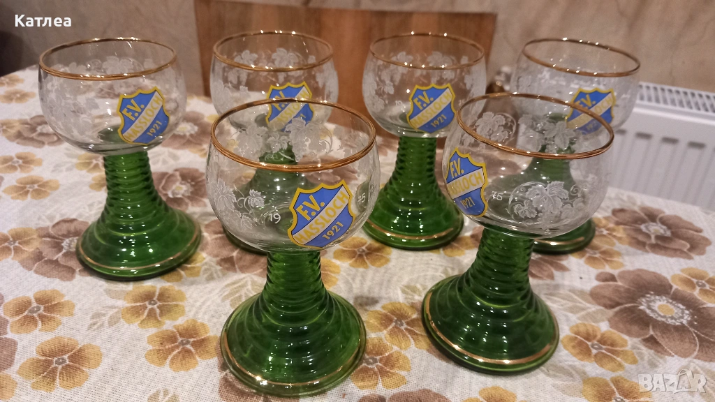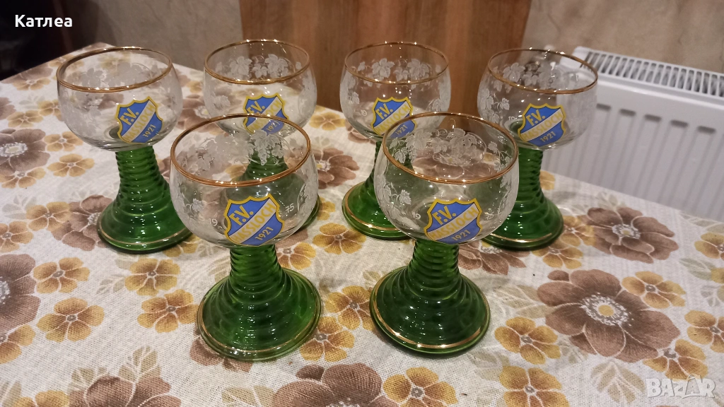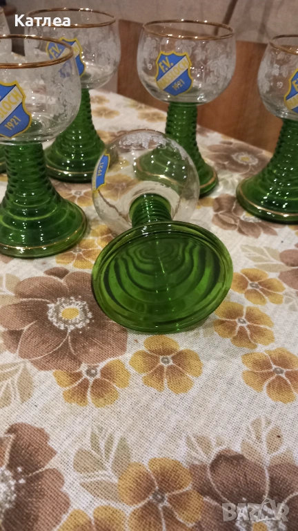 Шест броя френски кристални чаши с зелено столче с златни кантове в отлично състояние.