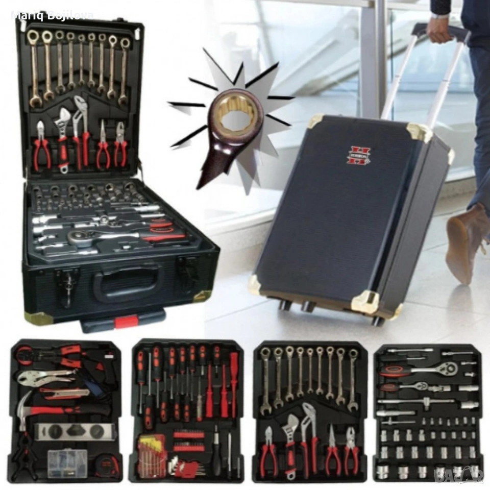 Обширен набор от инструменти за всякакви ремонтни и монтажни дейности. Инструментите са изработени от здрави и издръжливи материали за дълготрайна употреба. Кутията е оборудвана с колела и телескопична дръжка за лесно пренасяне. Всеки инструмент има своето място в кутията за лесен достъп и организация. Подходящ за различни видове ремонтни дейности - автомобилни, домашни, промишлени и други.