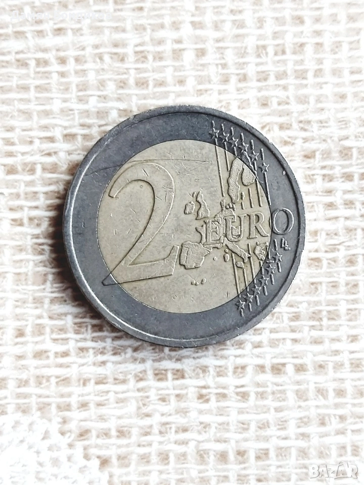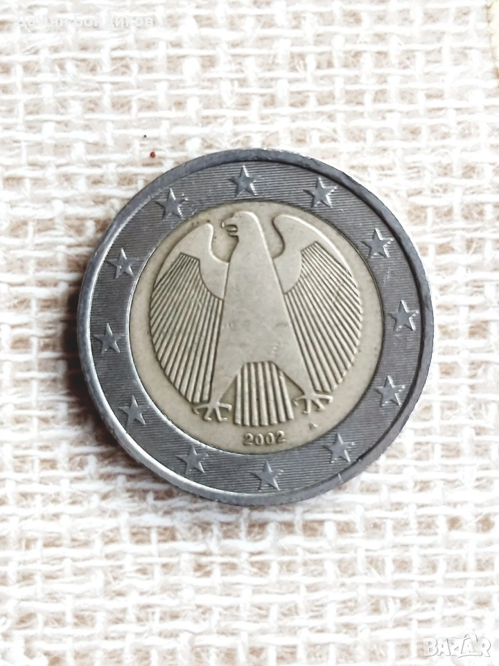 Продавам 2 евро 2002 година с буквата "А". На монетата е изобразен традиционният немски орел с разперени криле, около него са изобразени европейските звезди.Годината и буквата са изписани под орела.Монетата няма дефекти.