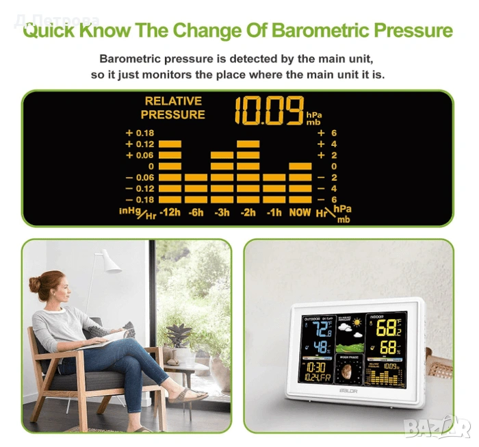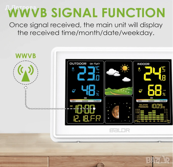 Функции: Показва вътрешна и външна температура и влажност, атмосферно налягане, лунни фази и разполага с атомен часовник.