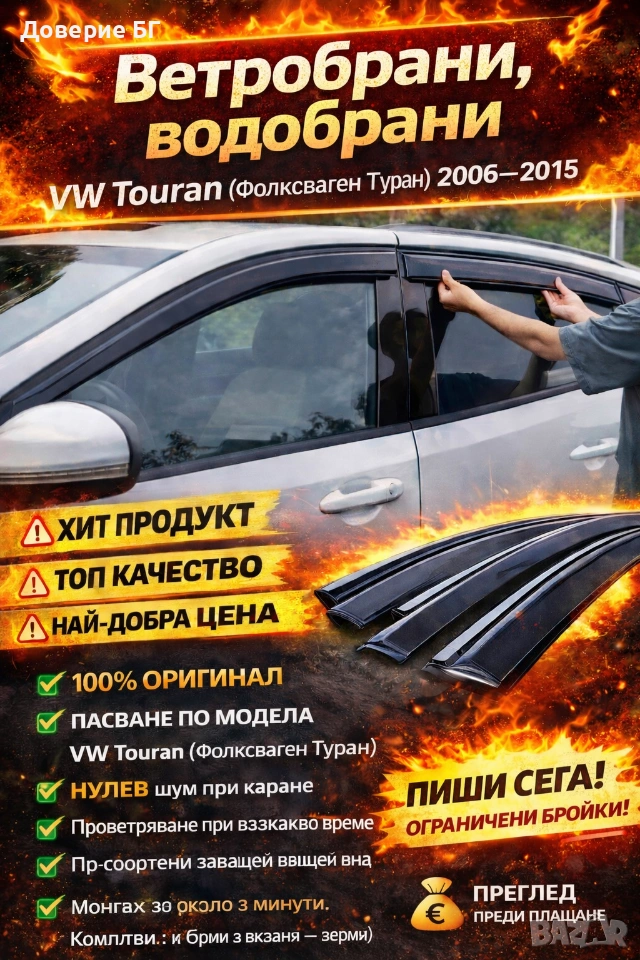 Продавам чисто нови, оригинални ветробрани (водобрани), предназначени за VW Touran (Фолксваген Туран), моделни години 2006–2015. Подходящи за повече комфорт при шофиране и защита при всякакви атмосферни условия.