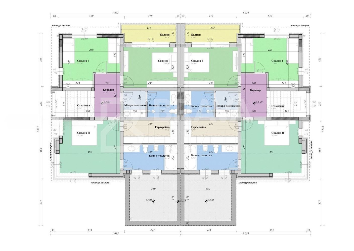 -Втори етаж 121 кв.м: три спални, едната със собствена баня с тоалетна, още една баня с тоалетна на етажа, гардеробна и мокро помещение