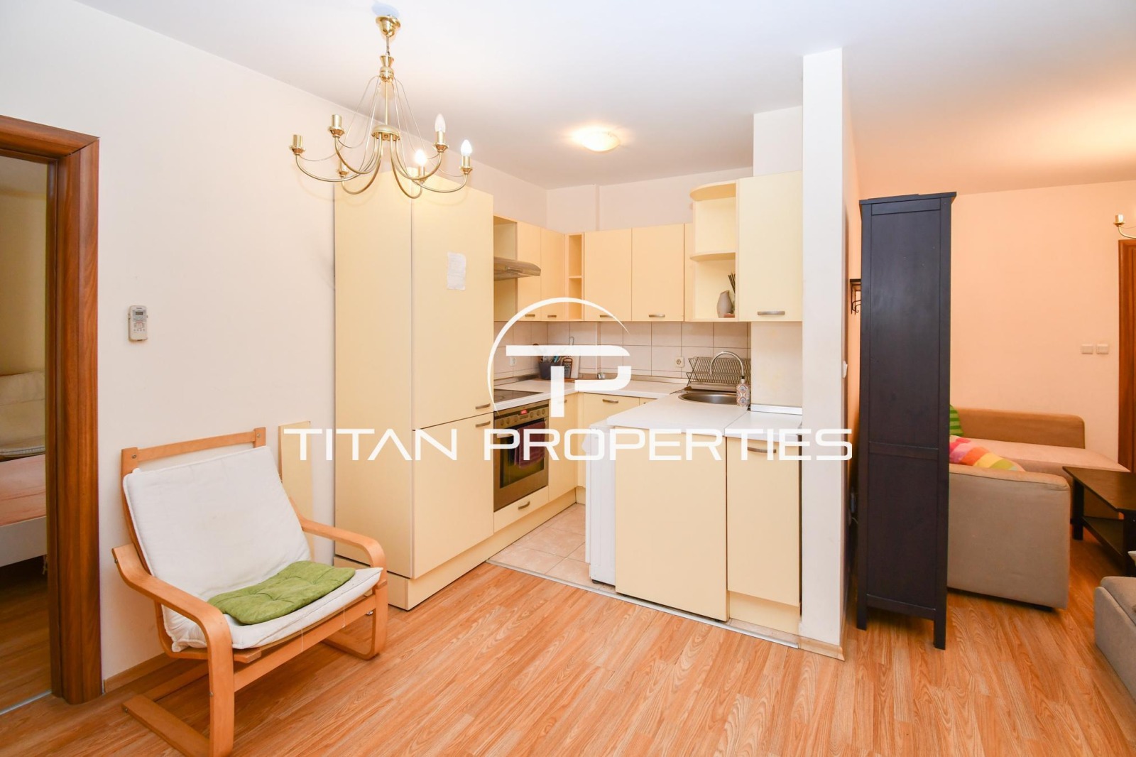 Разпределението включва три спални и дневна с кухненски бокс, голяма тераса и две бани. Апартаментът е напълно обзаведен и се отоплява на ток. Месечният наем е 920 EUR.