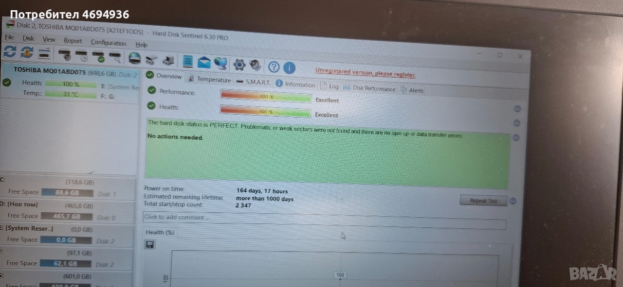 HDD 2.5 toshiba 750GB.на 158дни ползван на 100процента → Обява 53641882