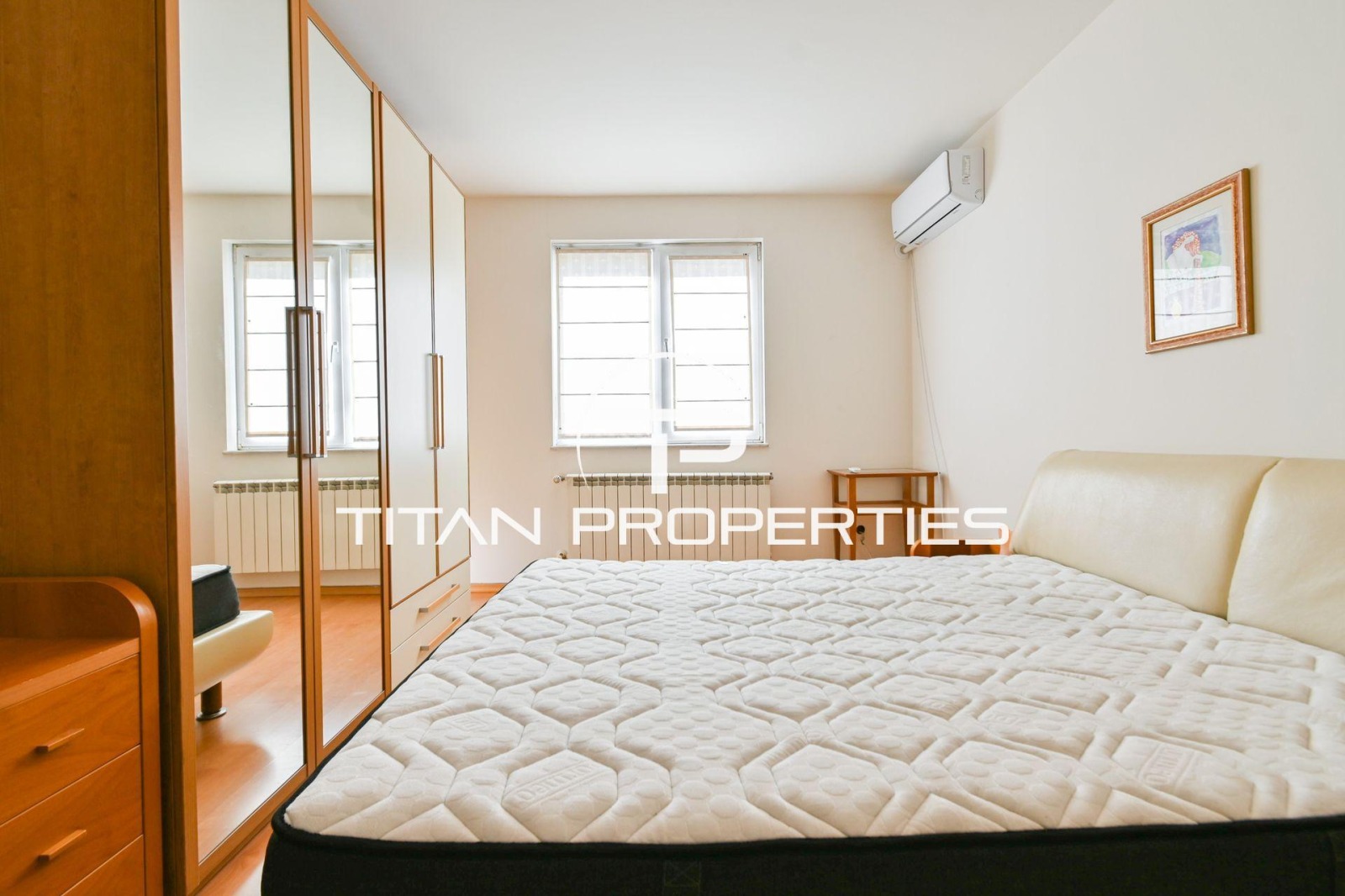 Титан Пропъртис - офис Младост с радост предлага на Вашето внимание тристаен апартамент под наем в кв. Манастирски ливади, София. Жилището е с площ 120 кв.м и се намира на втори етаж в нова пететажна сграда. Изложението е юг/изток/запад. Функционалното разпределение включва хол с кухненски бокс, две спални, баня с тоалетна, отделна тоалетна, тераса и мокро помещение. Апартаментът е обзаведен и се отоплява на ток, посредством климатици.