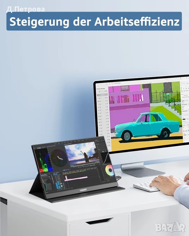 Продавам тънък и лек преносим монитор YODOIT, подходящ за работа, пътуване, гейминг и втори екран към лаптоп или компютър.