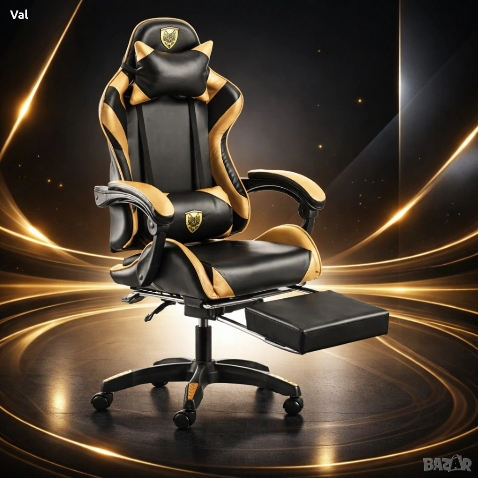 Черен геймърски стол с златисти акценти и разтегляема поставка за крака