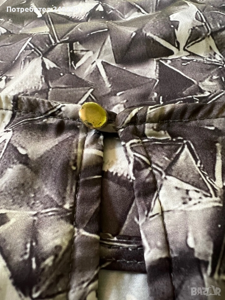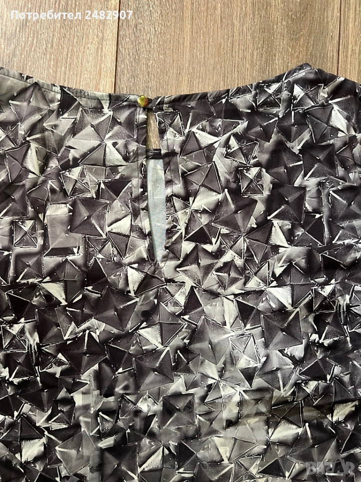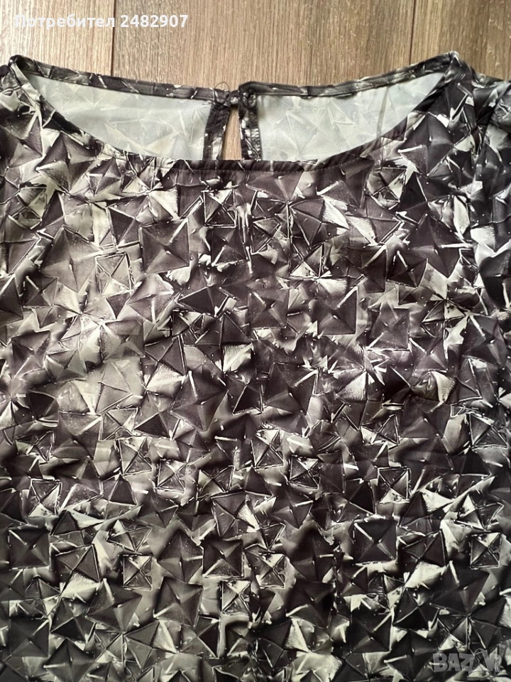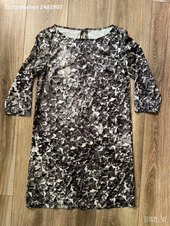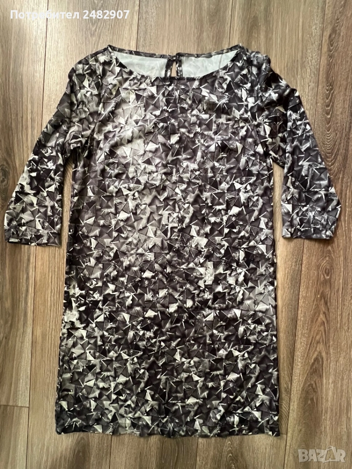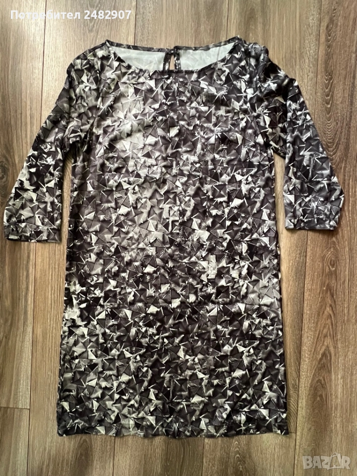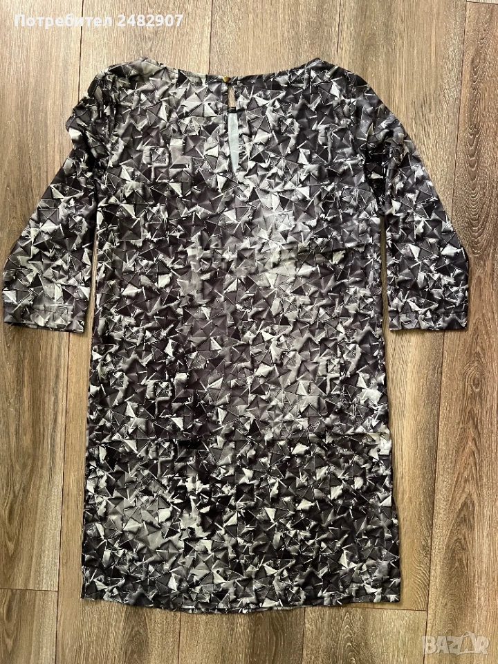 Дамска рокля/ Туника - сатен, размер S. Ширина в раменете - 37 см, ширина под мишниците - 45 см, ширина в долната част - 51 см, дължина от рамото до долу - 85 см, дължина на ръкава от рамото - 43 см, ширина на ръкава в долната част - 13 см. Много запазена, обличана веднъж за повод, без забележки. Много тънка, мека и приятна на допир, с едно копче на врата, не е еластична, не се мачка.