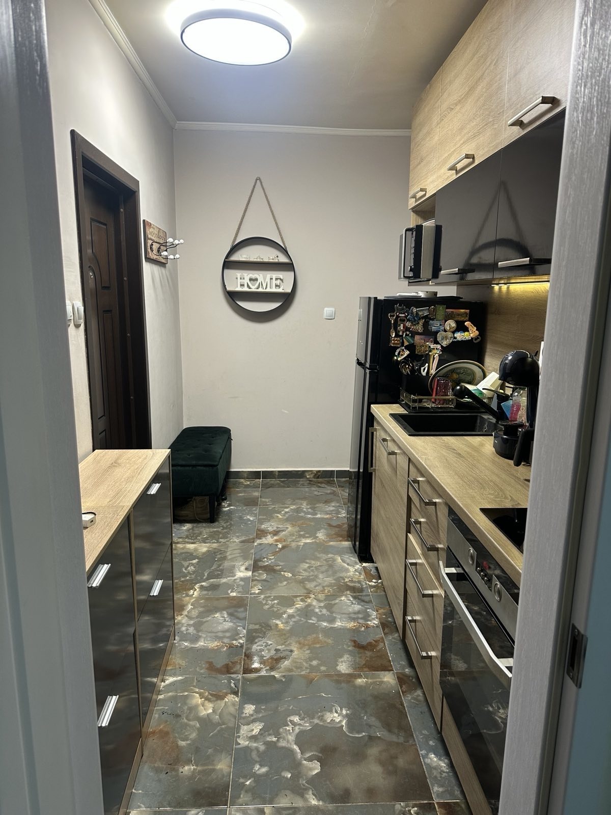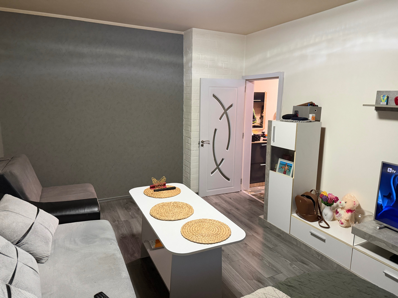 Преустроена гарсониера в двустаен апартамент. Състои се от дневна с усвоен балкон, кухненски бокс, изнесен в коридора, спалня, баня с тоалетна и антре. Напълно обзаведена.
